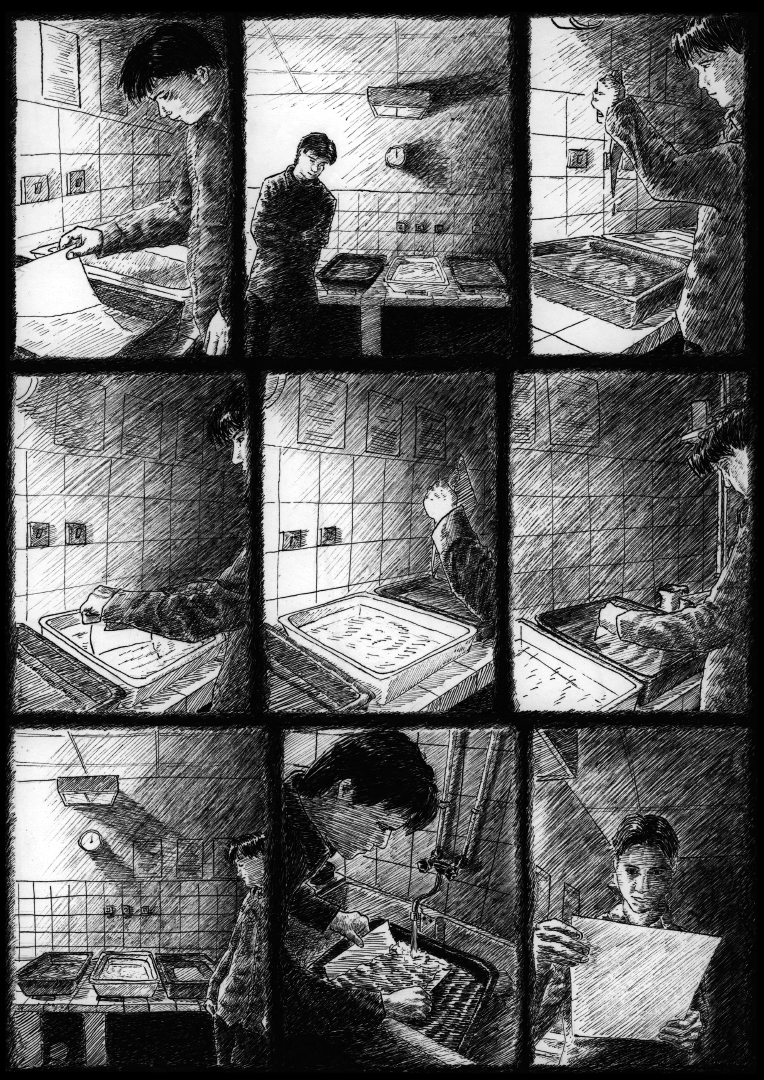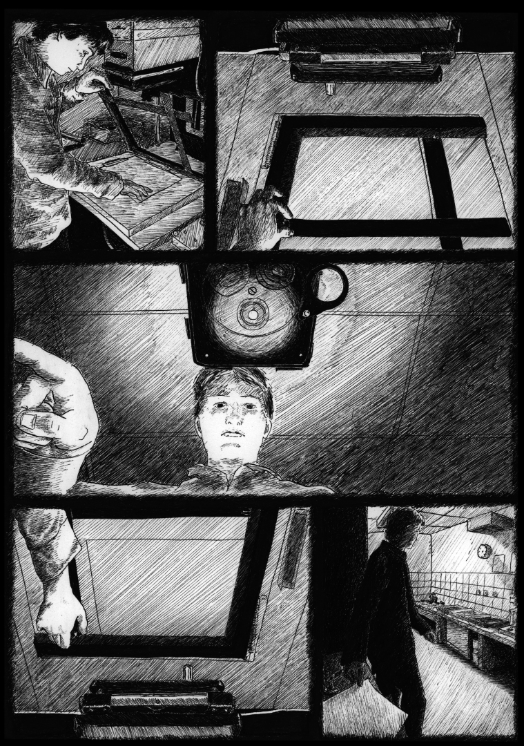 La lumière de ces 5 planches de bande dessinée est issue d’une seule source lumineuse située au milieu de l’histoire. Dans cette case a lieu le moment de l’insolation du papier photographique. A ce moment ce passe un phénomène qui semble dématérialiser la lumière. Le papier photographique sensible à la lumière et vierge toute insolation reçoit la lumière d’une image pendant un temps choisis. Le papier est alors impressionné, les photons projetés ont formés des atomes d’argent sur les zones éclairées. L’image est donc physiquement présente, bien qu’elle ne soit pas encore visible. C’est un moment curieux durant lequel la lumière est la source d’une image invisible. Quand l’image se fait attendre.